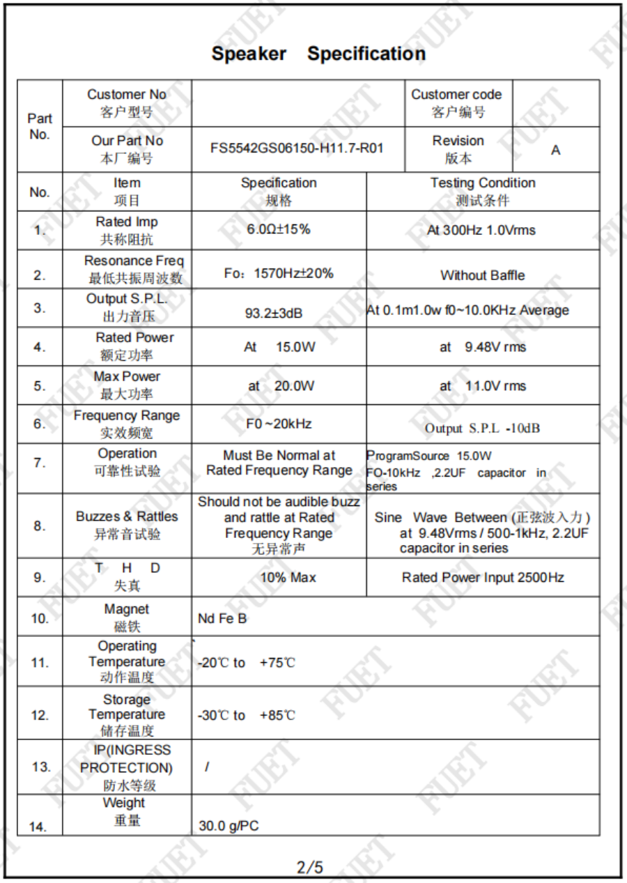 阻抗 | 6.0Ω±15% | At 300Hz 1.0Vrms |